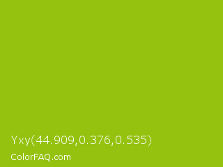 Yxy 44.909,0.376,0.535 Color is a normal lime color and the nearest color is Pistachio Green #9dc209. Hex code #94c20f and RGB value is rgb(148,194,15). In RGB color space, this color is composed of 58% red, 76% green, 6% blue, In CMYK color space, this color is composed of 24% cyan, 0% magenta, 92% yellow , 24% black , In HSL color space, this color has a hue angle of 75° , 86% saturation and 41% lightness.