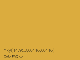 Yxy 44.913,0.446,0.446 Color is a normal orange color and the nearest color is Gold Metallic #d4af37. Hex code #dbac3e and RGB value is rgb(219,172,62). In RGB color space, this color is composed of 86% red, 67% green, 24% blue, In CMYK color space, this color is composed of 0% cyan, 21% magenta, 72% yellow , 14% black , In HSL color space, this color has a hue angle of 42° , 69% saturation and 55% lightness.