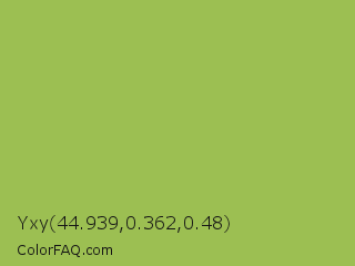 Yxy 44.939,0.362,0.48 Color is a normal lime color and the nearest color is Middle Green Yellow #acbf60. Hex code #9cbf52 and RGB value is rgb(156,191,82). In RGB color space, this color is composed of 61% red, 75% green, 32% blue, In CMYK color space, this color is composed of 18% cyan, 0% magenta, 57% yellow , 25% black , In HSL color space, this color has a hue angle of 79° , 46% saturation and 54% lightness.