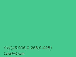 Yxy 45.006,0.268,0.428 Color is a normal green color and the nearest color is Ocean Green #48bf91. Hex code #46c98c and RGB value is rgb(70,201,140). In RGB color space, this color is composed of 27% red, 79% green, 55% blue, In CMYK color space, this color is composed of 65% cyan, 0% magenta, 30% yellow , 21% black , In HSL color space, this color has a hue angle of 152° , 55% saturation and 53% lightness.
