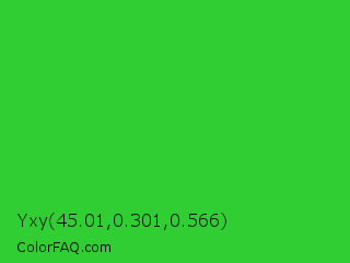Yxy 45.01,0.301,0.566 Color is a normal green color and the nearest color is Lime Green #32cd32. Hex code #31ce33 and RGB value is rgb(49,206,51). In RGB color space, this color is composed of 19% red, 81% green, 20% blue, In CMYK color space, this color is composed of 76% cyan, 0% magenta, 75% yellow , 19% black , In HSL color space, this color has a hue angle of 121° , 62% saturation and 50% lightness.