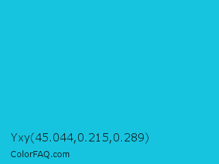 Yxy 45.044,0.215,0.289 Color is a normal cyan color and the nearest color is Battery Charged Blue #1dacd6. Hex code #16c4e0 and RGB value is rgb(22,196,224). In RGB color space, this color is composed of 9% red, 77% green, 88% blue, In CMYK color space, this color is composed of 90% cyan, 13% magenta, 0% yellow , 12% black , In HSL color space, this color has a hue angle of 188° , 82% saturation and 48% lightness.