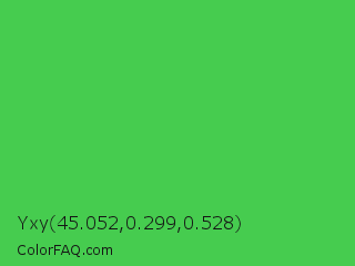 Yxy 45.052,0.299,0.528 Color is a normal green color and the nearest color is UFO Green #3cd070. Hex code #46cc4f and RGB value is rgb(70,204,79). In RGB color space, this color is composed of 27% red, 80% green, 31% blue, In CMYK color space, this color is composed of 66% cyan, 0% magenta, 61% yellow , 20% black , In HSL color space, this color has a hue angle of 124° , 57% saturation and 54% lightness.