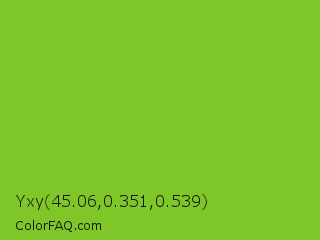 Yxy 45.06,0.351,0.539 Color is a normal green color and the nearest color is Lima #76bd17. Hex code #7fc628 and RGB value is rgb(127,198,40). In RGB color space, this color is composed of 50% red, 78% green, 16% blue, In CMYK color space, this color is composed of 36% cyan, 0% magenta, 80% yellow , 22% black , In HSL color space, this color has a hue angle of 87° , 66% saturation and 47% lightness.