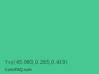 Yxy 45.083,0.265,0.419 Color is a normal green color and the nearest color is Ocean Green #48bf91. Hex code #46c991 and RGB value is rgb(70,201,145). In RGB color space, this color is composed of 27% red, 79% green, 57% blue, In CMYK color space, this color is composed of 65% cyan, 0% magenta, 28% yellow , 21% black , In HSL color space, this color has a hue angle of 154° , 55% saturation and 53% lightness.
