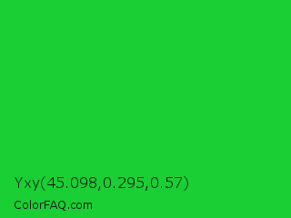 Yxy 45.098,0.295,0.57 Color is a normal green color and the nearest color is Lime Green #32cd32. Hex code #19cf34 and RGB value is rgb(25,207,52). In RGB color space, this color is composed of 10% red, 81% green, 20% blue, In CMYK color space, this color is composed of 88% cyan, 0% magenta, 75% yellow , 19% black , In HSL color space, this color has a hue angle of 129° , 78% saturation and 45% lightness.