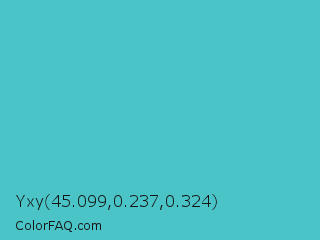 Yxy 45.099,0.237,0.324 Color is a normal cyan color and the nearest color is Sea Serpent #4bc7cf. Hex code #4bc4c7 and RGB value is rgb(75,196,199). In RGB color space, this color is composed of 29% red, 77% green, 78% blue, In CMYK color space, this color is composed of 62% cyan, 2% magenta, 0% yellow , 22% black , In HSL color space, this color has a hue angle of 181° , 53% saturation and 54% lightness.
