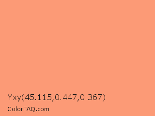 Yxy 45.115,0.447,0.367 Color is a light orange color and the nearest color is Light Salmon #ffa07a. Hex code #fc9a76 and RGB value is rgb(252,154,118). In RGB color space, this color is composed of 99% red, 60% green, 46% blue, In CMYK color space, this color is composed of 0% cyan, 39% magenta, 53% yellow , 1% black , In HSL color space, this color has a hue angle of 16° , 96% saturation and 73% lightness.
