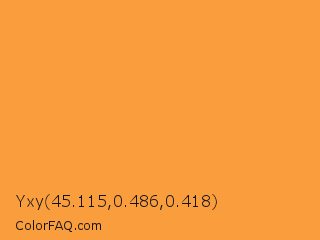 Yxy 45.115,0.486,0.418 Color is a light orange color and the nearest color is Neon Carrot #ffa343. Hex code #fa9e3d and RGB value is rgb(250,158,61). In RGB color space, this color is composed of 98% red, 62% green, 24% blue, In CMYK color space, this color is composed of 0% cyan, 37% magenta, 76% yellow , 2% black , In HSL color space, this color has a hue angle of 31° , 95% saturation and 61% lightness.