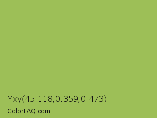 Yxy 45.118,0.359,0.473 Color is a normal green color and the nearest color is Middle Green Yellow #acbf60. Hex code #9dbf57 and RGB value is rgb(157,191,87). In RGB color space, this color is composed of 62% red, 75% green, 34% blue, In CMYK color space, this color is composed of 18% cyan, 0% magenta, 54% yellow , 25% black , In HSL color space, this color has a hue angle of 80° , 45% saturation and 55% lightness.