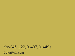 Yxy 45.122,0.407,0.449 Color is a normal yellow color and the nearest color is Vegas Gold #c5b358. Hex code #c5b452 and RGB value is rgb(197,180,82). In RGB color space, this color is composed of 77% red, 71% green, 32% blue, In CMYK color space, this color is composed of 0% cyan, 9% magenta, 58% yellow , 23% black , In HSL color space, this color has a hue angle of 51° , 50% saturation and 55% lightness.