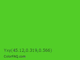 Yxy 45.12,0.319,0.566 Color is a normal green color and the nearest color is Harlequin Green #46cb18. Hex code #52cc26 and RGB value is rgb(82,204,38). In RGB color space, this color is composed of 32% red, 80% green, 15% blue, In CMYK color space, this color is composed of 60% cyan, 0% magenta, 81% yellow , 20% black , In HSL color space, this color has a hue angle of 104° , 69% saturation and 47% lightness.