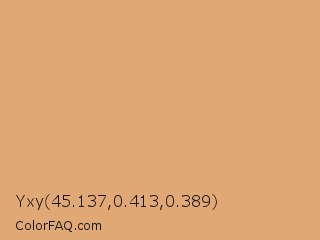 Yxy 45.137,0.413,0.389 Color is a light orange color and the nearest color is Fawn #e5aa70. Hex code #e0a875 and RGB value is rgb(224,168,117). In RGB color space, this color is composed of 88% red, 66% green, 46% blue, In CMYK color space, this color is composed of 0% cyan, 25% magenta, 48% yellow , 12% black , In HSL color space, this color has a hue angle of 29° , 63% saturation and 67% lightness.
