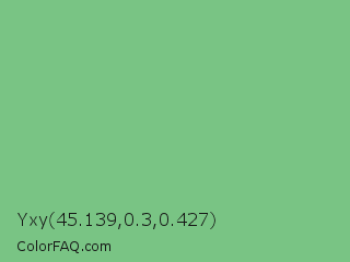Yxy 45.139,0.3,0.427 Color is a light green color and the nearest color is De York #7ac488. Hex code #79c484 and RGB value is rgb(121,196,132). In RGB color space, this color is composed of 47% red, 77% green, 52% blue, In CMYK color space, this color is composed of 38% cyan, 0% magenta, 33% yellow , 23% black , In HSL color space, this color has a hue angle of 129° , 39% saturation and 62% lightness.