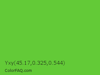 Yxy 45.17,0.325,0.544 Color is a normal green color and the nearest color is Green RYB #66b032. Hex code #63ca37 and RGB value is rgb(99,202,55). In RGB color space, this color is composed of 39% red, 79% green, 22% blue, In CMYK color space, this color is composed of 51% cyan, 0% magenta, 73% yellow , 21% black , In HSL color space, this color has a hue angle of 102° , 58% saturation and 50% lightness.