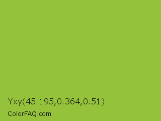 Yxy 45.195,0.364,0.51 Color is a normal green color and the nearest color is Yellow Green #9acd32. Hex code #94c23b and RGB value is rgb(148,194,59). In RGB color space, this color is composed of 58% red, 76% green, 23% blue, In CMYK color space, this color is composed of 24% cyan, 0% magenta, 70% yellow , 24% black , In HSL color space, this color has a hue angle of 80° , 53% saturation and 50% lightness.