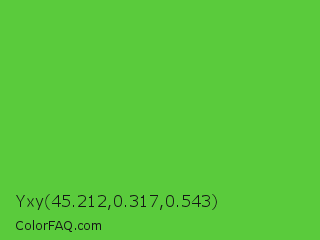 Yxy 45.212,0.317,0.543 Color is a normal green color and the nearest color is Green RYB #66b032. Hex code #5acb3c and RGB value is rgb(90,203,60). In RGB color space, this color is composed of 35% red, 80% green, 24% blue, In CMYK color space, this color is composed of 56% cyan, 0% magenta, 70% yellow , 20% black , In HSL color space, this color has a hue angle of 107° , 58% saturation and 52% lightness.