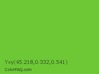Yxy 45.218,0.332,0.541 Color is a normal green color and the nearest color is Green RYB #66b032. Hex code #6cc935 and RGB value is rgb(108,201,53). In RGB color space, this color is composed of 42% red, 79% green, 21% blue, In CMYK color space, this color is composed of 46% cyan, 0% magenta, 74% yellow , 21% black , In HSL color space, this color has a hue angle of 98° , 58% saturation and 50% lightness.