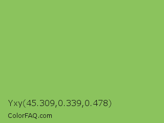 Yxy 45.309,0.339,0.478 Color is a normal green color and the nearest color is Dollar Bill #85bb65. Hex code #8bc35d and RGB value is rgb(139,195,93). In RGB color space, this color is composed of 55% red, 76% green, 36% blue, In CMYK color space, this color is composed of 29% cyan, 0% magenta, 52% yellow , 24% black , In HSL color space, this color has a hue angle of 93° , 46% saturation and 56% lightness.