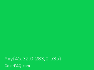 Yxy 45.32,0.283,0.535 Color is a normal green color and the nearest color is Malachite #0bda51. Hex code #0bcf52 and RGB value is rgb(11,207,82). In RGB color space, this color is composed of 4% red, 81% green, 32% blue, In CMYK color space, this color is composed of 95% cyan, 0% magenta, 60% yellow , 19% black , In HSL color space, this color has a hue angle of 142° , 90% saturation and 43% lightness.