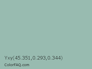 Yxy 45.351,0.293,0.344 Color is a light green color and the nearest color is Summer Green #96bbab. Hex code #98bbb0 and RGB value is rgb(152,187,176). In RGB color space, this color is composed of 60% red, 73% green, 69% blue, In CMYK color space, this color is composed of 19% cyan, 0% magenta, 6% yellow , 27% black , In HSL color space, this color has a hue angle of 161° , 20% saturation and 66% lightness.