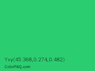 Yxy 45.368,0.274,0.482 Color is a normal green color and the nearest color is UFO Green #3cd070. Hex code #2bcd71 and RGB value is rgb(43,205,113). In RGB color space, this color is composed of 17% red, 80% green, 44% blue, In CMYK color space, this color is composed of 79% cyan, 0% magenta, 45% yellow , 20% black , In HSL color space, this color has a hue angle of 146° , 65% saturation and 49% lightness.