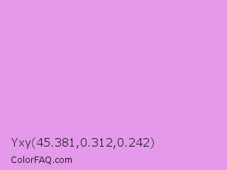 Yxy 45.381,0.312,0.242 Color is a light magenta color and the nearest color is Bright Lilac #d891ef. Hex code #e599ea and RGB value is rgb(229,153,234). In RGB color space, this color is composed of 90% red, 60% green, 92% blue, In CMYK color space, this color is composed of 2% cyan, 35% magenta, 0% yellow , 8% black , In HSL color space, this color has a hue angle of 296° , 66% saturation and 76% lightness.
