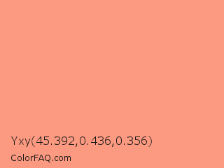 Yxy 45.392,0.436,0.356 Color is a light red color and the nearest color is Vivid Tangerine #ff9980. Hex code #fc9a81 and RGB value is rgb(252,154,129). In RGB color space, this color is composed of 99% red, 60% green, 51% blue, In CMYK color space, this color is composed of 0% cyan, 39% magenta, 49% yellow , 1% black , In HSL color space, this color has a hue angle of 12° , 95% saturation and 75% lightness.