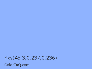 Yxy 45.3,0.237,0.236 Color is a light blue color and the nearest color is Jordy Blue #8ab9f1. Hex code #8fb3ff and RGB value is rgb(143,179,255). In RGB color space, this color is composed of 56% red, 70% green, 100% blue, In CMYK color space, this color is composed of 44% cyan, 30% magenta, 0% yellow , 0% black , In HSL color space, this color has a hue angle of 221° , 100% saturation and 78% lightness.