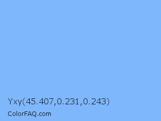 Yxy 45.407,0.231,0.243 Color is a light blue color and the nearest color is French Sky Blue #77b5fe. Hex code #7fb7fc and RGB value is rgb(127,183,252). In RGB color space, this color is composed of 50% red, 72% green, 99% blue, In CMYK color space, this color is composed of 50% cyan, 27% magenta, 0% yellow , 1% black , In HSL color space, this color has a hue angle of 213° , 95% saturation and 74% lightness.