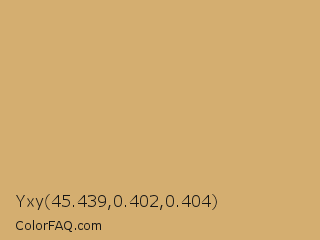 Yxy 45.439,0.402,0.404 Color is a light orange color and the nearest color is Laser #c8b568. Hex code #d4ae70 and RGB value is rgb(212,174,112). In RGB color space, this color is composed of 83% red, 68% green, 44% blue, In CMYK color space, this color is composed of 0% cyan, 18% magenta, 47% yellow , 17% black , In HSL color space, this color has a hue angle of 37° , 54% saturation and 64% lightness.