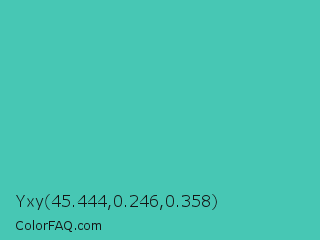 Yxy 45.444,0.246,0.358 Color is a normal cyan color and the nearest color is Puerto Rico #3fc1aa. Hex code #47c7b4 and RGB value is rgb(71,199,180). In RGB color space, this color is composed of 28% red, 78% green, 71% blue, In CMYK color space, this color is composed of 64% cyan, 0% magenta, 10% yellow , 22% black , In HSL color space, this color has a hue angle of 171° , 53% saturation and 53% lightness.