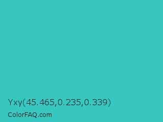 Yxy 45.465,0.235,0.339 Color is a normal cyan color and the nearest color is Maximum Blue Green #30bfbf. Hex code #37c7c0 and RGB value is rgb(55,199,192). In RGB color space, this color is composed of 22% red, 78% green, 75% blue, In CMYK color space, this color is composed of 72% cyan, 0% magenta, 4% yellow , 22% black , In HSL color space, this color has a hue angle of 177° , 57% saturation and 50% lightness.
