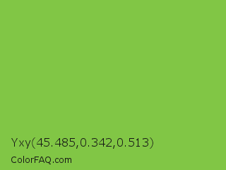 Yxy 45.485,0.342,0.513 Color is a normal green color and the nearest color is Sushi #87ab39. Hex code #81c645 and RGB value is rgb(129,198,69). In RGB color space, this color is composed of 51% red, 78% green, 27% blue, In CMYK color space, this color is composed of 35% cyan, 0% magenta, 65% yellow , 22% black , In HSL color space, this color has a hue angle of 92° , 53% saturation and 52% lightness.