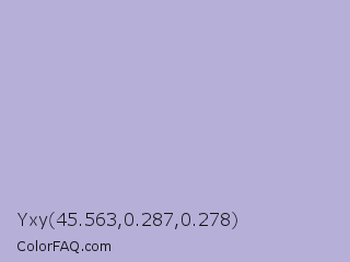 Yxy 45.563,0.287,0.278 Color is a light indigo color and the nearest color is Lavender Gray #bdbbd7. Hex code #b6afd8 and RGB value is rgb(182,175,216). In RGB color space, this color is composed of 71% red, 69% green, 85% blue, In CMYK color space, this color is composed of 16% cyan, 19% magenta, 0% yellow , 15% black , In HSL color space, this color has a hue angle of 250° , 34% saturation and 77% lightness.