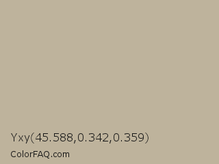 Yxy 45.588,0.342,0.359 Color is a light orange color and the nearest color is Malta #bdb2a1. Hex code #beb39c and RGB value is rgb(190,179,156). In RGB color space, this color is composed of 75% red, 70% green, 61% blue, In CMYK color space, this color is composed of 0% cyan, 6% magenta, 18% yellow , 25% black , In HSL color space, this color has a hue angle of 41° , 21% saturation and 68% lightness.