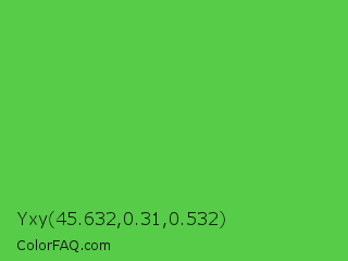 Yxy 45.632,0.31,0.532 Color is a normal green color and the nearest color is Apple #4fa83d. Hex code #56cc48 and RGB value is rgb(86,204,72). In RGB color space, this color is composed of 34% red, 80% green, 28% blue, In CMYK color space, this color is composed of 58% cyan, 0% magenta, 65% yellow , 20% black , In HSL color space, this color has a hue angle of 114° , 56% saturation and 54% lightness.