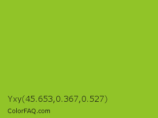 Yxy 45.653,0.367,0.527 Color is a normal green color and the nearest color is Atlantis #97cd2d. Hex code #91c428 and RGB value is rgb(145,196,40). In RGB color space, this color is composed of 57% red, 77% green, 16% blue, In CMYK color space, this color is composed of 26% cyan, 0% magenta, 80% yellow , 23% black , In HSL color space, this color has a hue angle of 80° , 66% saturation and 46% lightness.