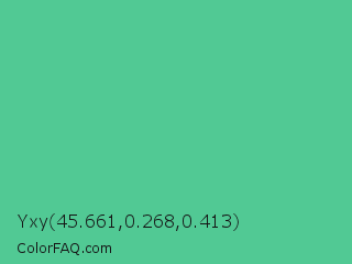 Yxy 45.661,0.268,0.413 Color is a normal green color and the nearest color is Ocean Green #48bf91. Hex code #51c994 and RGB value is rgb(81,201,148). In RGB color space, this color is composed of 32% red, 79% green, 58% blue, In CMYK color space, this color is composed of 60% cyan, 0% magenta, 26% yellow , 21% black , In HSL color space, this color has a hue angle of 154° , 53% saturation and 55% lightness.