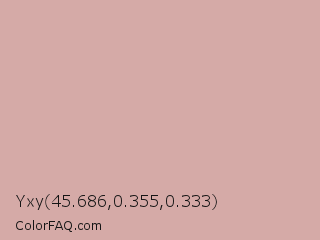 Yxy 45.686,0.355,0.333 Color is a light red color and the nearest color is Pastel Pink #dea5a4. Hex code #d5aaa7 and RGB value is rgb(213,170,167). In RGB color space, this color is composed of 84% red, 67% green, 65% blue, In CMYK color space, this color is composed of 0% cyan, 20% magenta, 22% yellow , 16% black , In HSL color space, this color has a hue angle of 4° , 35% saturation and 75% lightness.