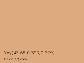 Yxy 45.68,0.399,0.379 Color is a light orange color and the nearest color is Tumbleweed #dea681. Hex code #ddaa80 and RGB value is rgb(221,170,128). In RGB color space, this color is composed of 87% red, 67% green, 50% blue, In CMYK color space, this color is composed of 0% cyan, 23% magenta, 42% yellow , 13% black , In HSL color space, this color has a hue angle of 27° , 58% saturation and 68% lightness.