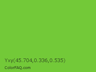 Yxy 45.704,0.336,0.535 Color is a normal green color and the nearest color is Green RYB #66b032. Hex code #73c938 and RGB value is rgb(115,201,56). In RGB color space, this color is composed of 45% red, 79% green, 22% blue, In CMYK color space, this color is composed of 43% cyan, 0% magenta, 72% yellow , 21% black , In HSL color space, this color has a hue angle of 96° , 57% saturation and 50% lightness.