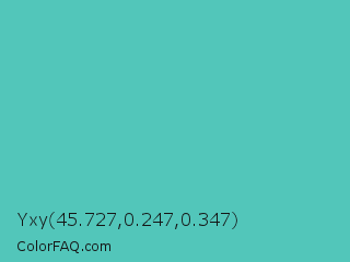 Yxy 45.727,0.247,0.347 Color is a normal cyan color and the nearest color is Fountain Blue #56b4be. Hex code #52c6ba and RGB value is rgb(82,198,186). In RGB color space, this color is composed of 32% red, 78% green, 73% blue, In CMYK color space, this color is composed of 59% cyan, 0% magenta, 6% yellow , 22% black , In HSL color space, this color has a hue angle of 174° , 50% saturation and 55% lightness.