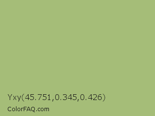Yxy 45.751,0.345,0.426 Color is a light green color and the nearest color is Olivine #9ab973. Hex code #a5bd78 and RGB value is rgb(165,189,120). In RGB color space, this color is composed of 65% red, 74% green, 47% blue, In CMYK color space, this color is composed of 13% cyan, 0% magenta, 37% yellow , 26% black , In HSL color space, this color has a hue angle of 81° , 34% saturation and 61% lightness.
