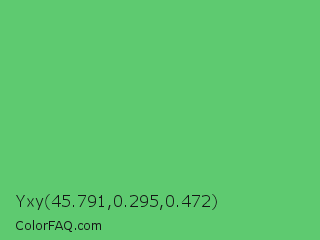 Yxy 45.791,0.295,0.472 Color is a normal green color and the nearest color is Emerald #50c878. Hex code #5eca70 and RGB value is rgb(94,202,112). In RGB color space, this color is composed of 37% red, 79% green, 44% blue, In CMYK color space, this color is composed of 53% cyan, 0% magenta, 45% yellow , 21% black , In HSL color space, this color has a hue angle of 130° , 50% saturation and 58% lightness.