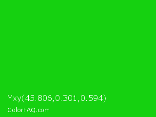 Yxy 45.806,0.301,0.594 Color is a normal green color and the nearest color is Vivid Malachite #00cc33. Hex code #15d110 and RGB value is rgb(21,209,16). In RGB color space, this color is composed of 8% red, 82% green, 6% blue, In CMYK color space, this color is composed of 90% cyan, 0% magenta, 92% yellow , 18% black , In HSL color space, this color has a hue angle of 118° , 86% saturation and 44% lightness.
