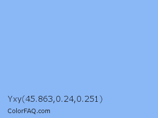 Yxy 45.863,0.24,0.251 Color is a light blue color and the nearest color is Jordy Blue #8ab9f1. Hex code #8ab7f5 and RGB value is rgb(138,183,245). In RGB color space, this color is composed of 54% red, 72% green, 96% blue, In CMYK color space, this color is composed of 44% cyan, 25% magenta, 0% yellow , 4% black , In HSL color space, this color has a hue angle of 215° , 84% saturation and 75% lightness.