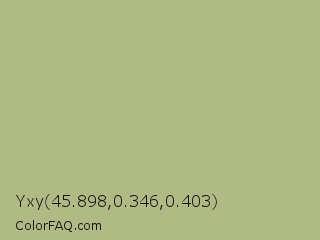 Yxy 45.898,0.346,0.403 Color is a light lime color and the nearest color is Swamp Green #acb78e. Hex code #afba84 and RGB value is rgb(175,186,132). In RGB color space, this color is composed of 69% red, 73% green, 52% blue, In CMYK color space, this color is composed of 6% cyan, 0% magenta, 29% yellow , 27% black , In HSL color space, this color has a hue angle of 72° , 28% saturation and 62% lightness.