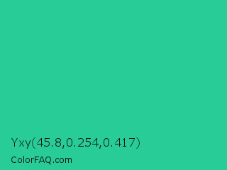 Yxy 45.8,0.254,0.417 Color is a normal green color and the nearest color is Shamrock #33cc99. Hex code #27cc96 and RGB value is rgb(39,204,150). In RGB color space, this color is composed of 15% red, 80% green, 59% blue, In CMYK color space, this color is composed of 81% cyan, 0% magenta, 26% yellow , 20% black , In HSL color space, this color has a hue angle of 160° , 68% saturation and 48% lightness.