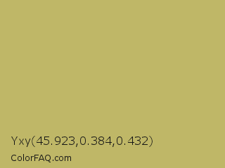 Yxy 45.923,0.384,0.432 Color is a normal yellow color and the nearest color is Dark Khaki #bdb76b. Hex code #bfb767 and RGB value is rgb(191,183,103). In RGB color space, this color is composed of 75% red, 72% green, 40% blue, In CMYK color space, this color is composed of 0% cyan, 4% magenta, 46% yellow , 25% black , In HSL color space, this color has a hue angle of 55° , 41% saturation and 58% lightness.